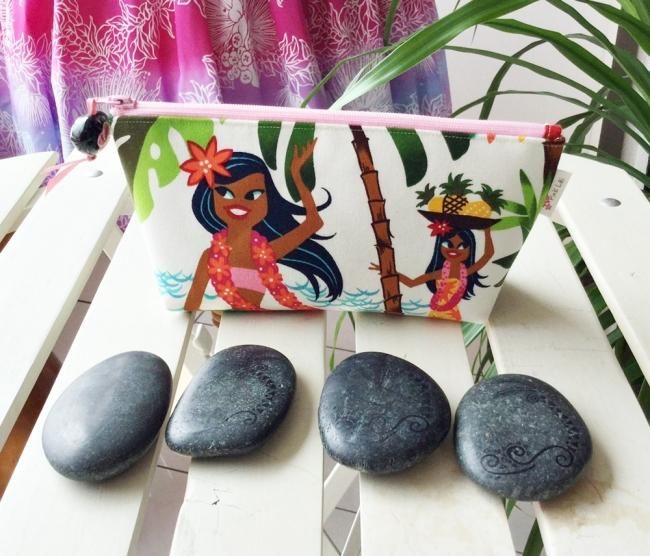 重くてかたい石(イリイリ)を収納することを考え、厚めのクッションでポーチの内側を4つに仕切って作りました。ハンドタオルやハンカチも一緒に収納できるのもうれしい。フラガールのマストアイテムです! しっかりとした作りで、きれいに座るタイプ。中身がひと目で確認できます。