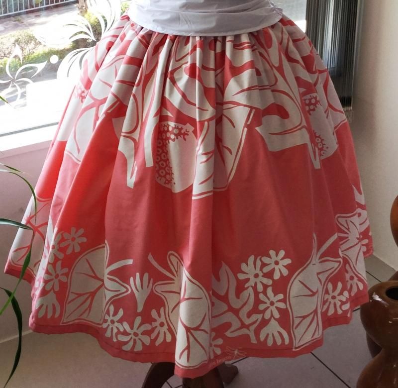 タヒチインポーツ社の生地を使用したシングルパウスカートです。 やさしい春色のサーモンピンクに白の組み合わせが爽やかな一枚です。