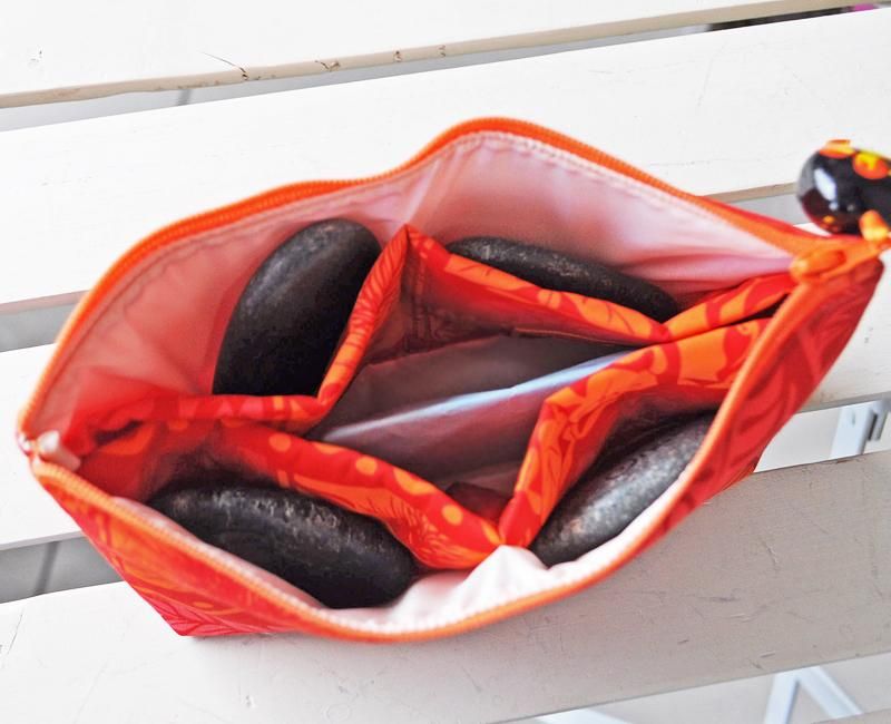 重くてかたい石(イリイリ)を収納することを考え、厚めのクッションでポーチの内側を4つに仕切って作りました。ハンドタオルやハンカチを一緒に収納できるのもうれしい。フラガールのマストアイテムです!