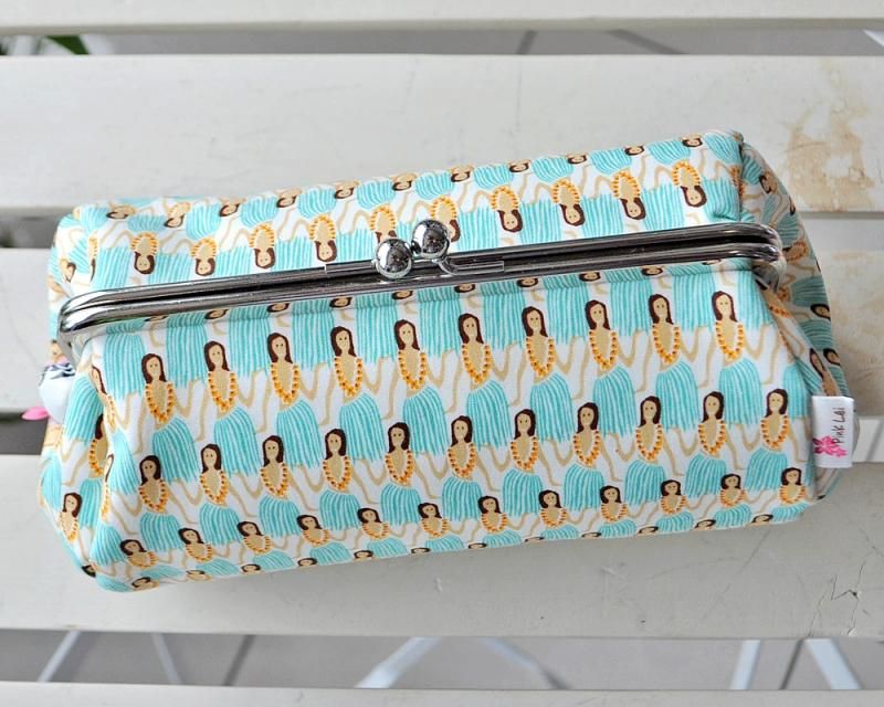 TOP > Pink Lei オリジナル【1点もの】 樽型特大がま口ポーチ 白・フラガール柄