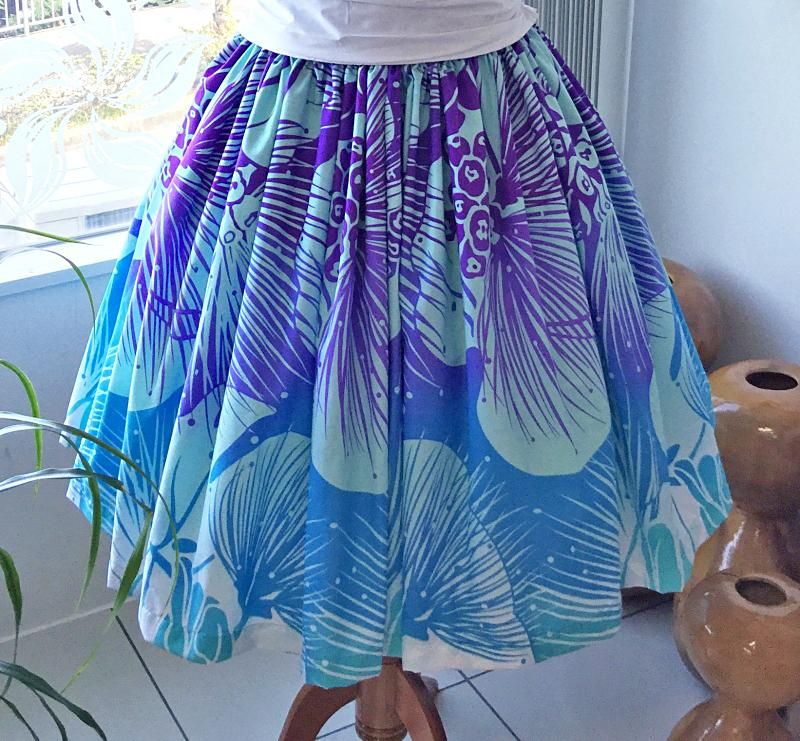 ブルーとパープルのグラデーションがきれいな、レフア柄の豪華なパウスカートです。