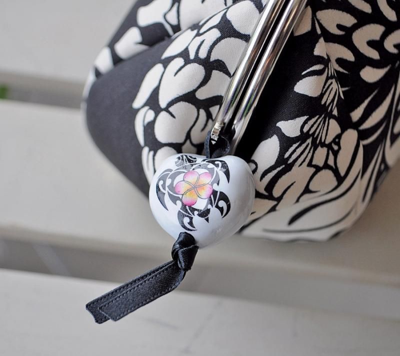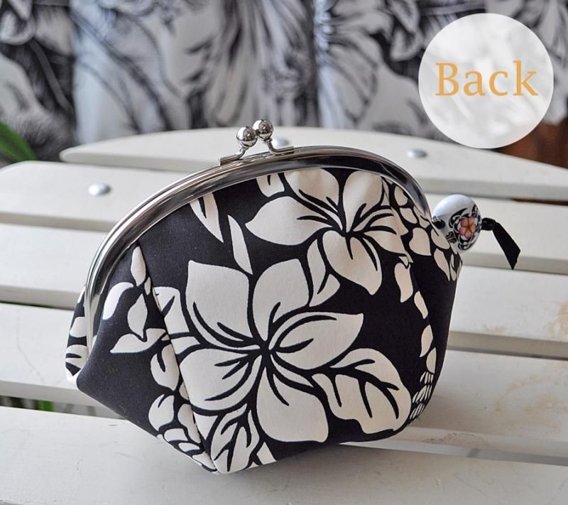がま口タイプのコロコロポーチ 黒・プルメリア&楽器柄