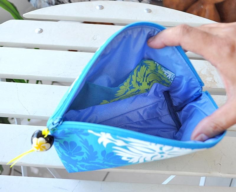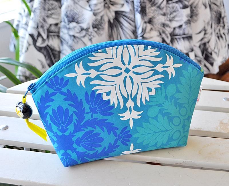 TOP > Pink Lei オリジナル【1点もの】 シェル型ファスナーポーチ ブルー・キルト柄