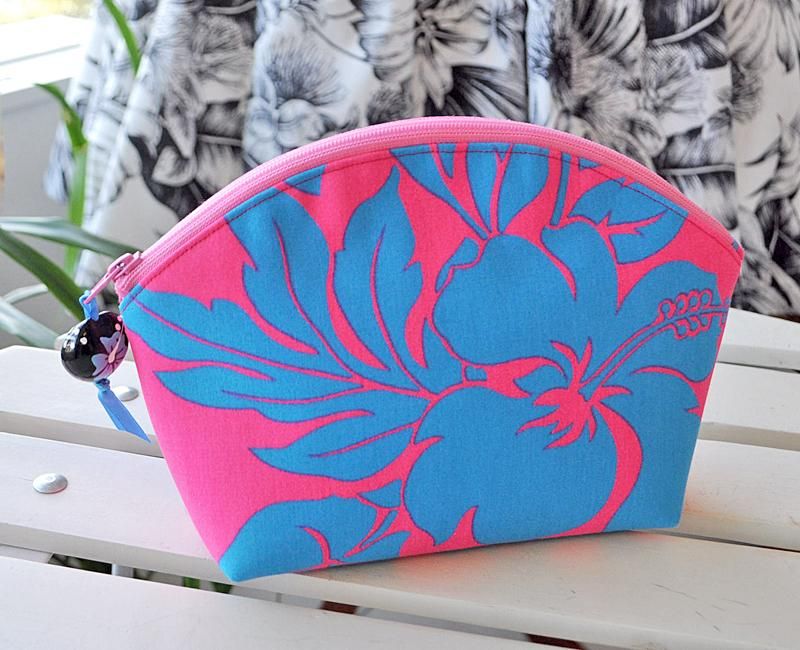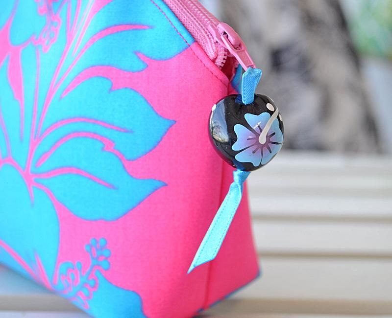 TOP > Pink Lei オリジナル【1点もの】 シェル型ファスナーポーチ ピンク&ブルー・ハイビスカス柄