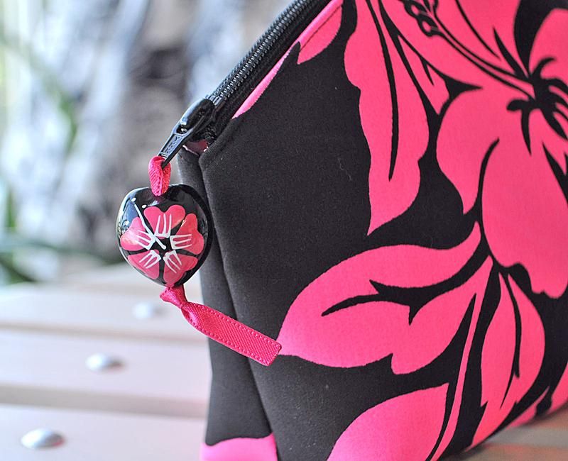 TOP > Pink Lei オリジナル【1点もの】 シェル型ファスナーポーチ ブラック&ピンク・ハイビスカス柄