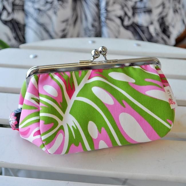 がま口タイプのひし型コスメポーチ ピンク&グリーン・モンステラ柄