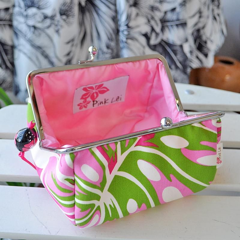 TOP > Pink Lei オリジナル【1点もの】 ひし型コスメポーチ ピンク&グリーン・モンステラ柄