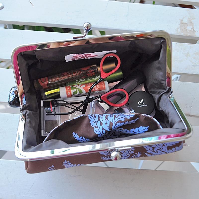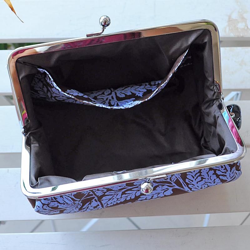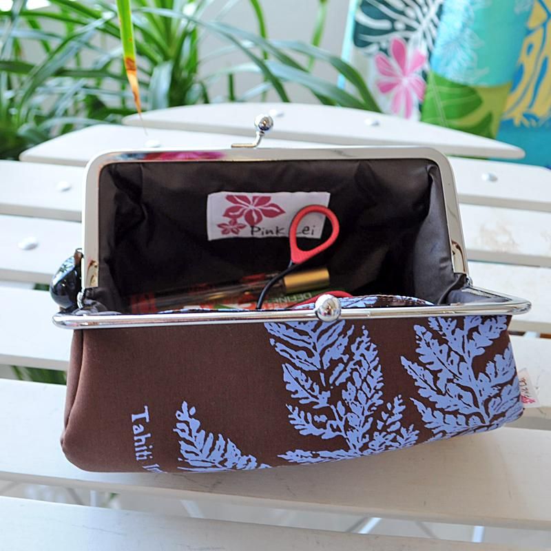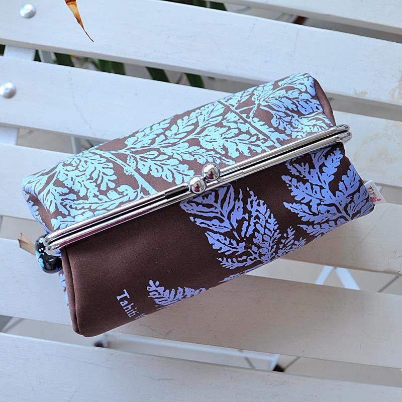 TOP > Pink Lei オリジナル【1点もの】 タヒチインポーツ/樽型特大がま口ポーチ ブラウン・シダ柄