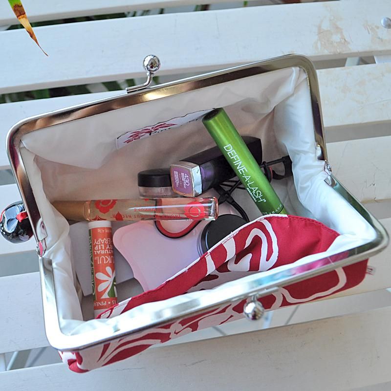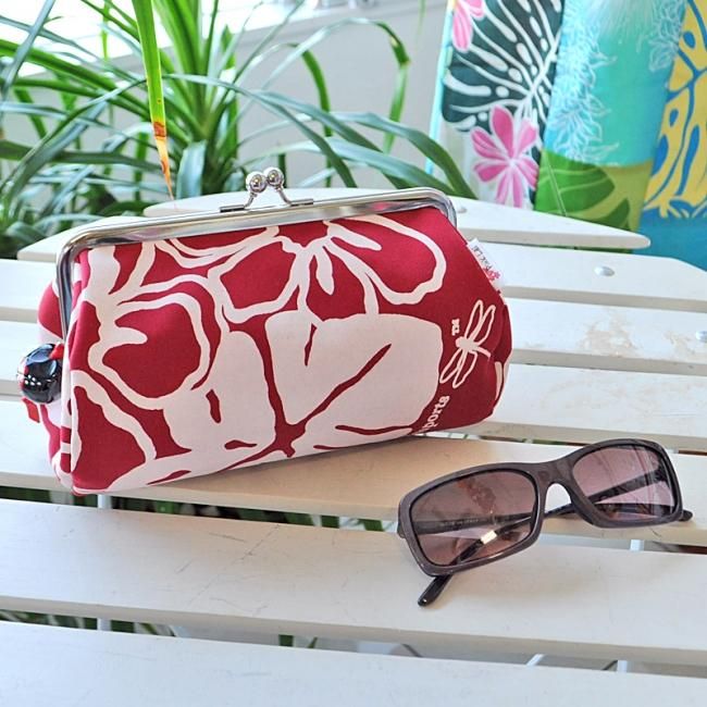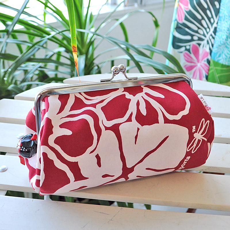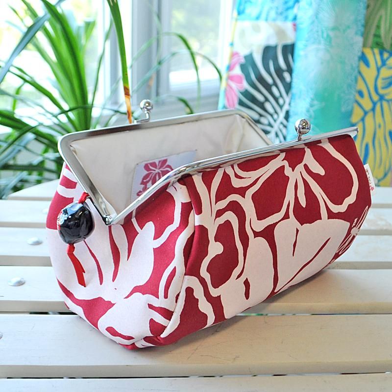 TOP > Pink Lei オリジナル【1点もの】 タヒチインポーツ/樽型特大がま口ポーチ レッド・アラマンダ柄