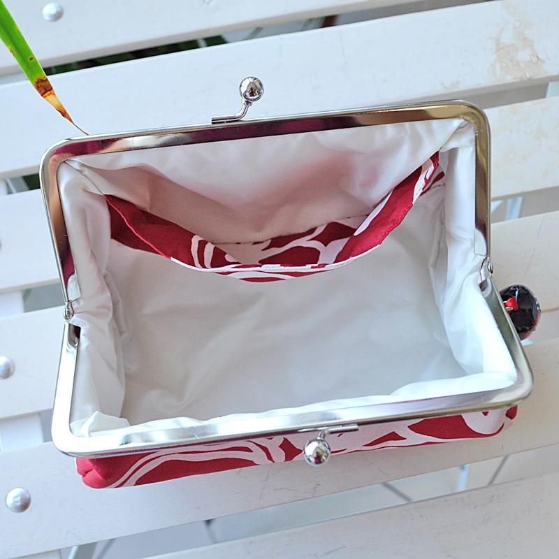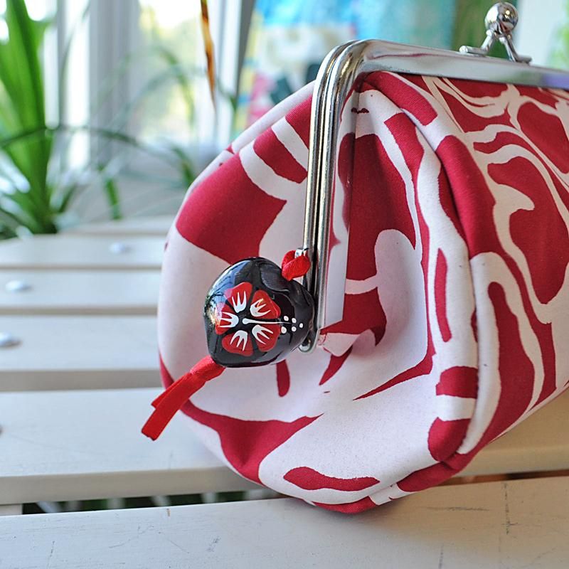 Pink Lei オリジナル【1点もの】 タヒチインポーツ/樽型特大がま口ポーチ レッド・アラマンダ柄