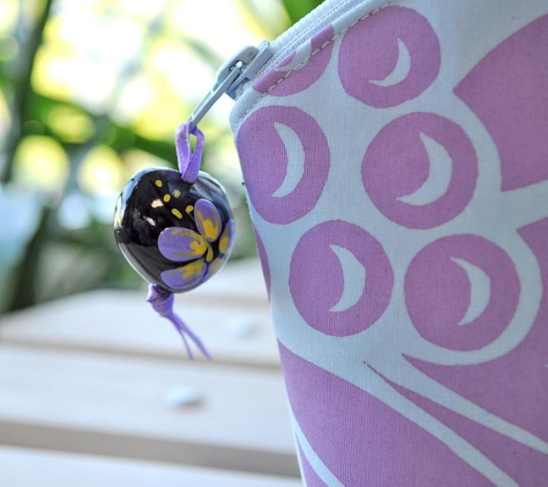 TOP > Pink Lei オリジナル【1点もの】タヒチインポーツ/シェル型ファスナーポーチ パープル・花とモンステラ柄