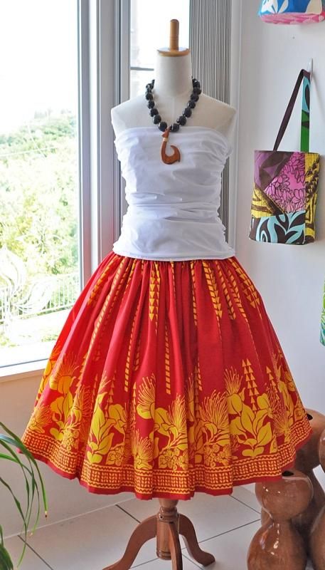 赤×黄色のシンプルな配色ながら、美しいレフアと古典柄が目を引くパウスカートです。