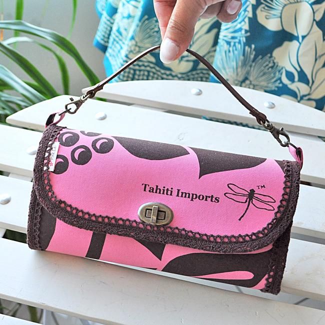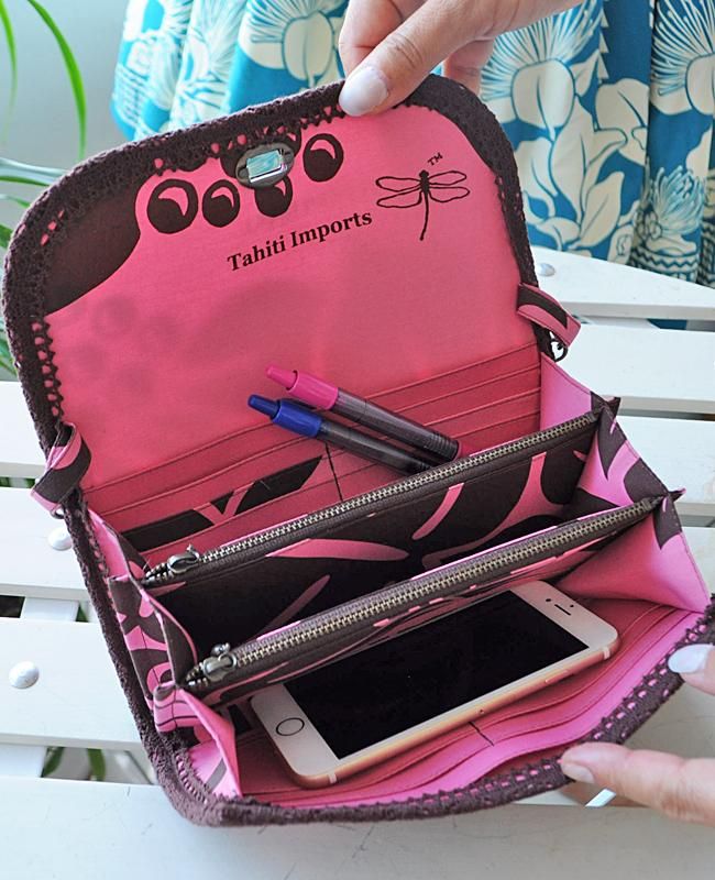 TOP > Pink Lei 【1点もの】タヒチインポーツ・スマホも入るお財布ポーチ(S)(ピンク・花とモンステラ柄)