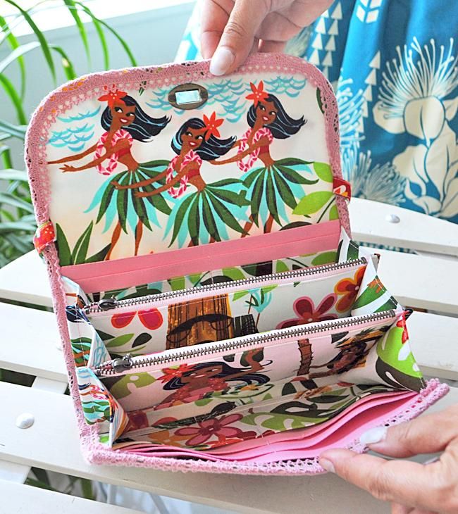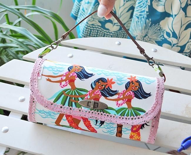 TOP > Pink Lei 【1点もの】アレクサンダーヘンリー/スマホも入るお財布ポーチ(S)#1(フラガール柄・白)
