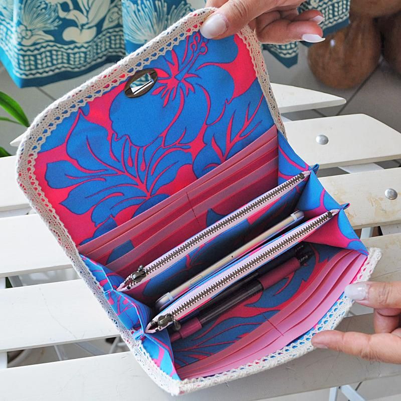 TOP > Pink Lei 【1点もの】スマホも入るお財布ポーチ(S)ストラップ無し(ピンク&ブルー・ハイビスカス柄)