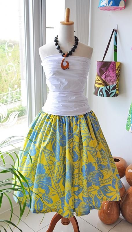 TOP > Pink Lei シングルパウ レモンイエロー&ライトブルー・古典フラワー柄 ウエストゴム4本 丈73cm