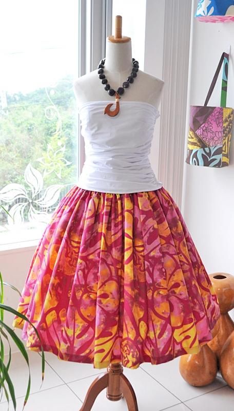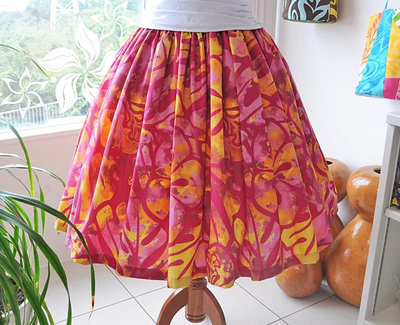 TOP > Pink Lei シングルパウ ディープピンク&イエロー・ハイビスカス柄 ウエストゴム4本 丈73cm