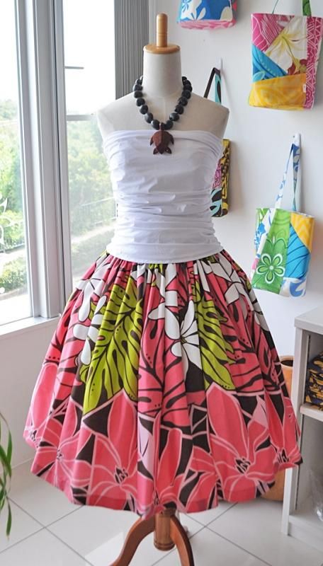 TOP > Pink Lei シングルパウ ピンク・ティアレ&モンステラ柄 ウエストゴム4本 丈73cm