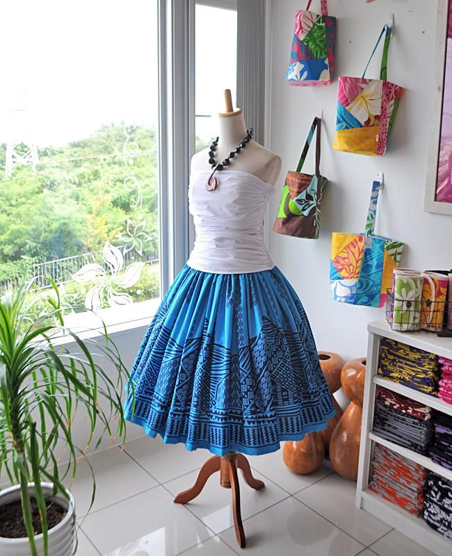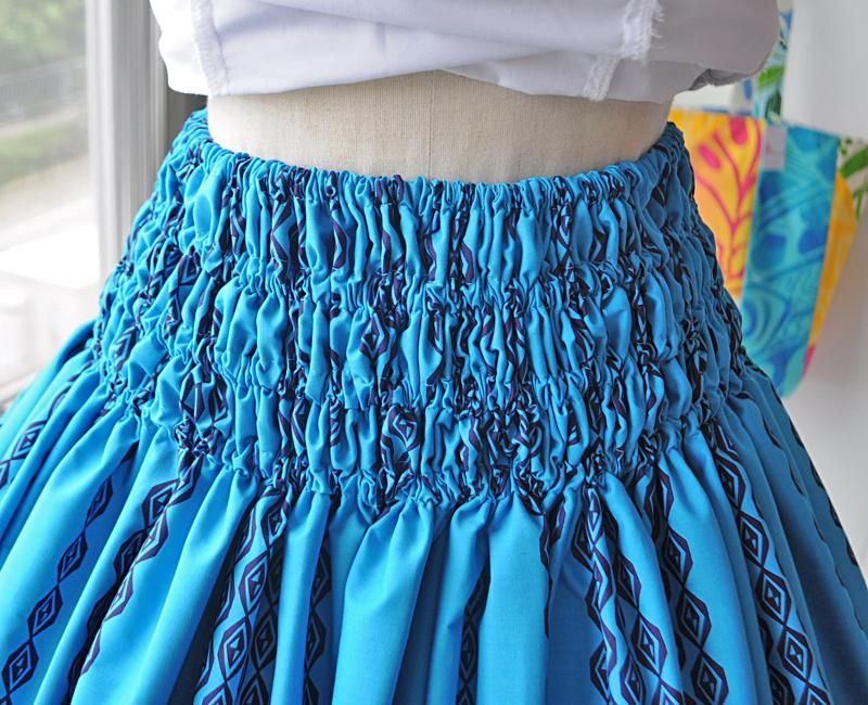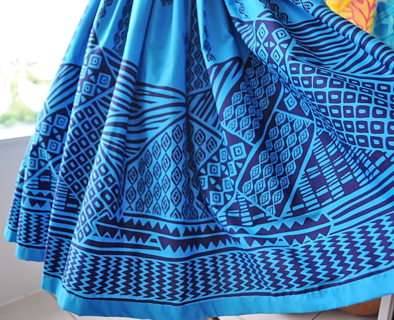 TOP > Pink Lei シングルパウ ブルー&ネイビー・ニューカヒコ柄 ウエストゴム4本 丈73cm