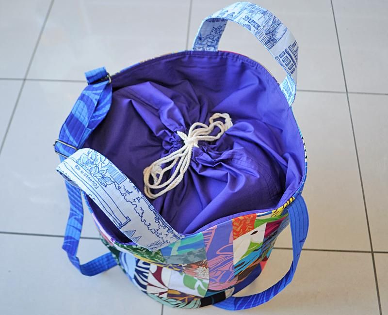 キルト作家さんとコラボして出来上がったオンリーワンのハワイアンパッチ・巾着&アジャスター付きバケツ型バッグ(L)です。