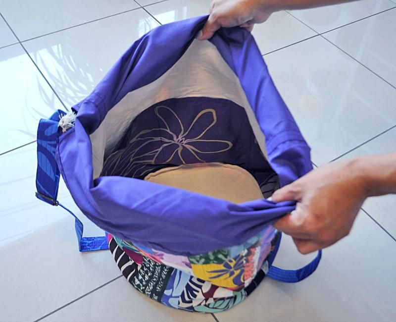 どのアングルから見ても飽きのこないバケツ型で、ハワイアンファブリック独特のカラフルな色合いが素敵な一品。