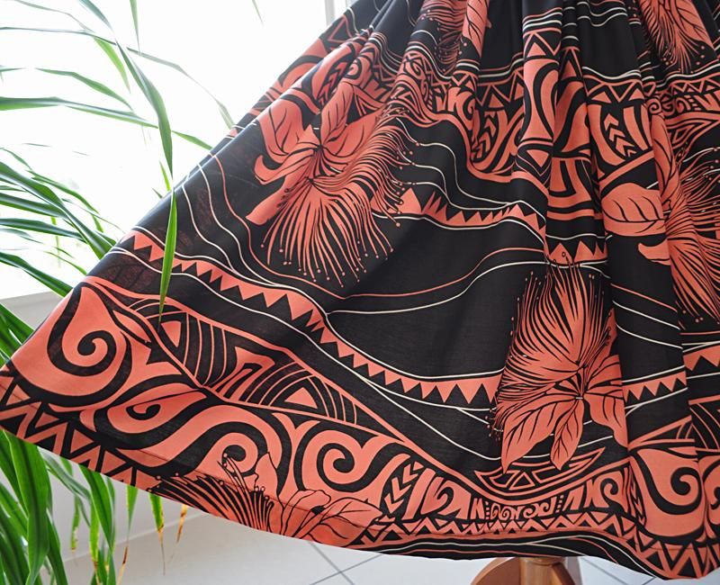 TOP > Pink Lei シングルパウ ブラック&サーモンピンク・レフア/古典柄 ウエストゴム4本 丈73cm