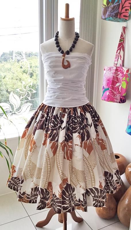 TOP > Pink Lei シングルパウ ベージュ&ブラウン モンステラ&タパ柄 ウエストゴム4本 丈73cm