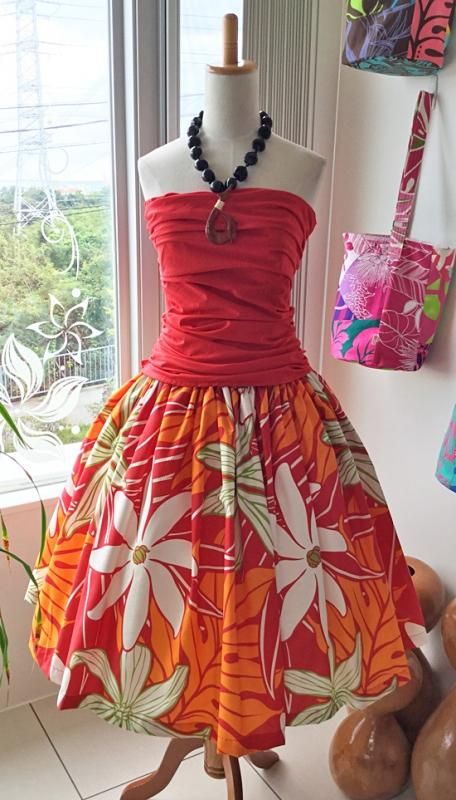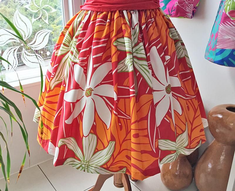 TOP > Pink Lei シングルパウ レッド&オレンジ&ホワイト ティアレ/モンステラ柄 ウエストゴム4本 丈73cm