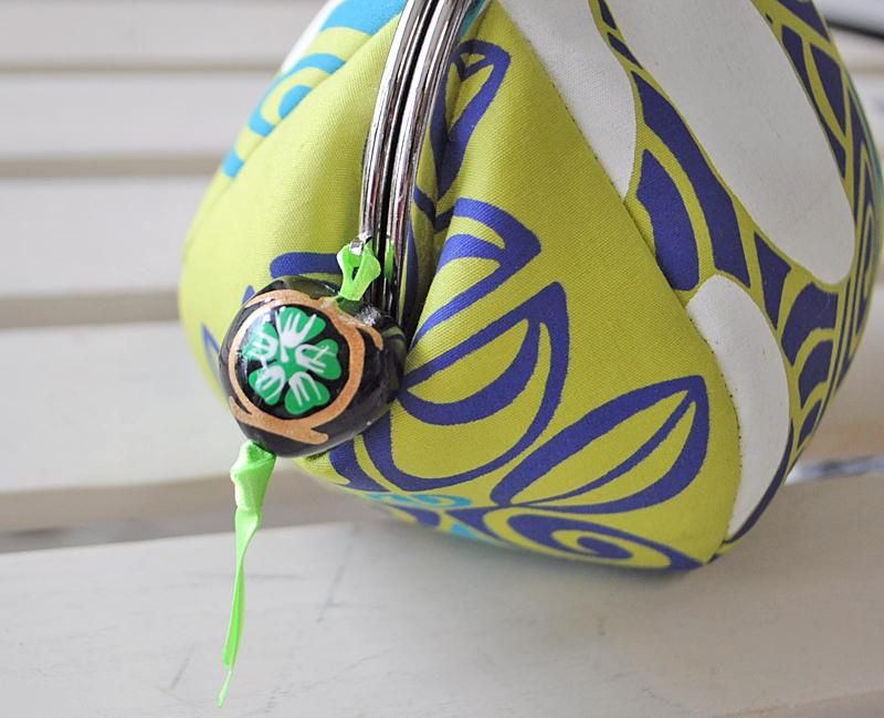 がま口タイプのコロコロポーチ オリーブ&ホワイト・ティアレ柄
