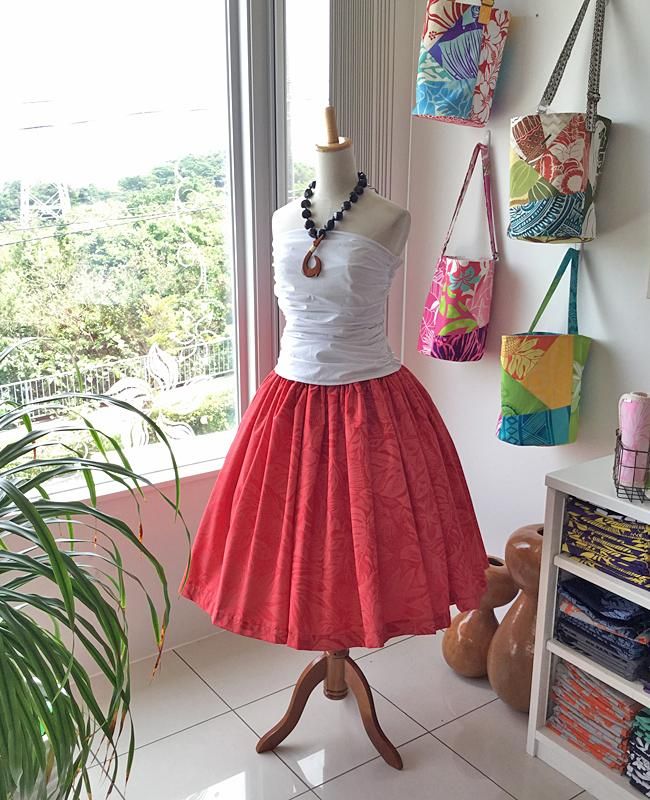 プルメリアやレフア、モンステラなどの草花が描かれたファブリックで仕立てたパウスカートです。鮮やかなレッドが印象的な一枚です。