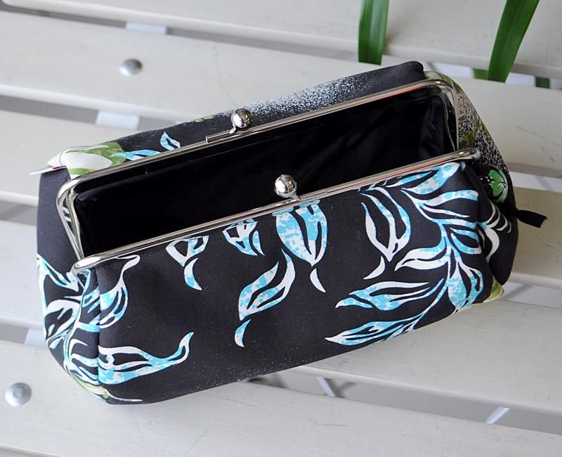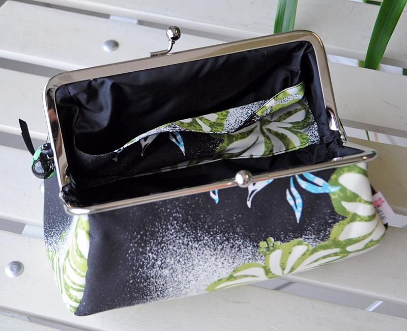 TOP > Pink Lei オリジナル【1点もの】 樽型特大がま口ポーチ ブラック&ブルー&グリーン・ハイビスカス柄