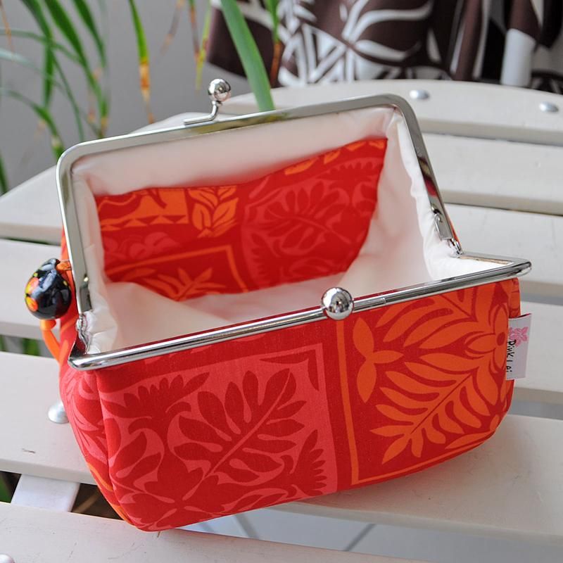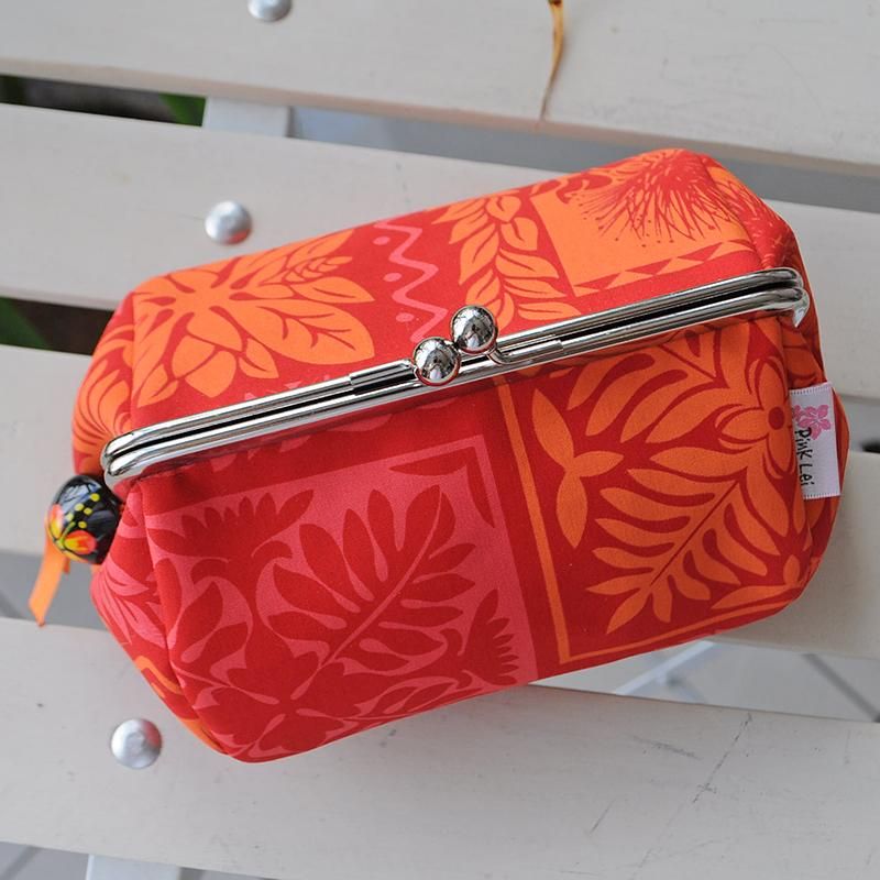 がま口タイプのひし型コスメポーチ レッド&オレンジ・ハワイアンキルト柄
