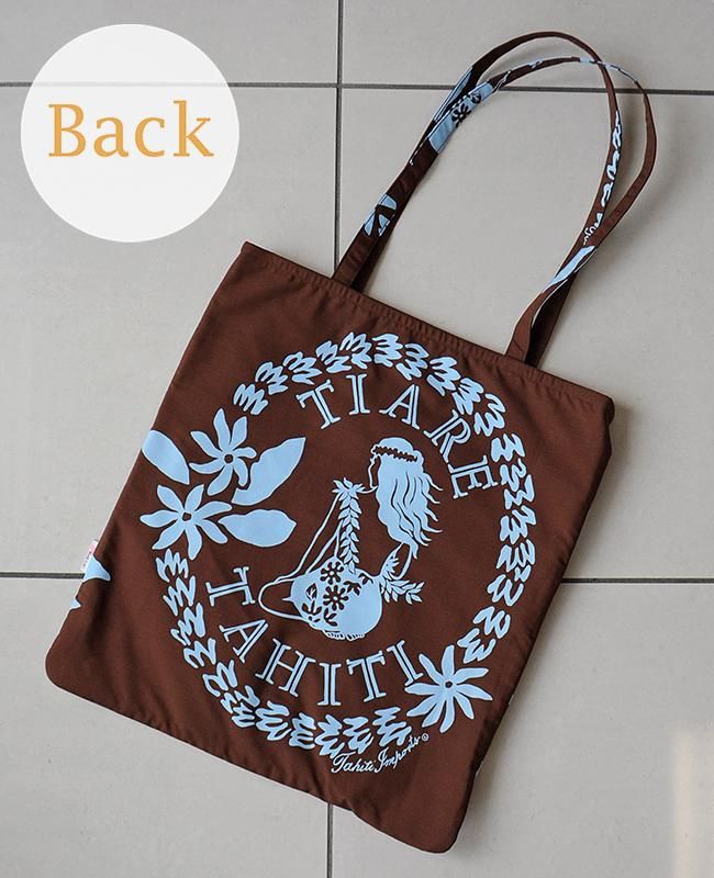 TOP > Pink Lei オリジナル【1点もの】タヒチインポーツ/A4ハワイアントートバッグ(帆布/マグネットあり) ブラウン&ベイビーブルー・タヒチガール&ティアレ柄