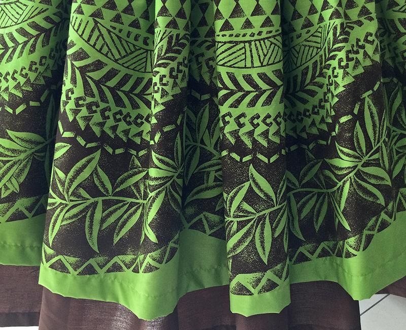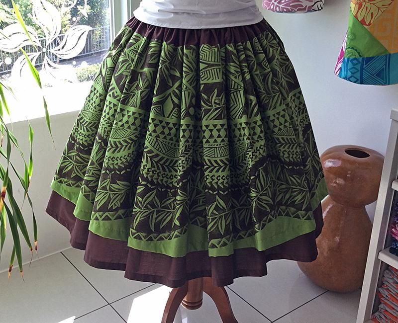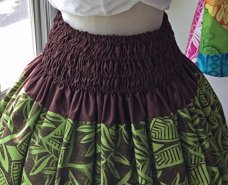 TOP > Pink Lei ダブルパウ グリーン&ブラウン・カヒコ柄 ウエストゴム4本 丈73cm