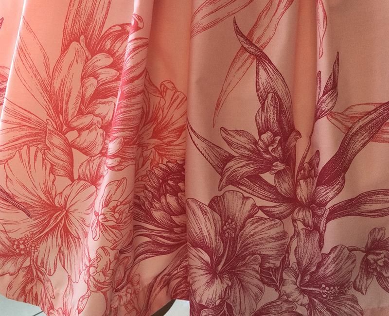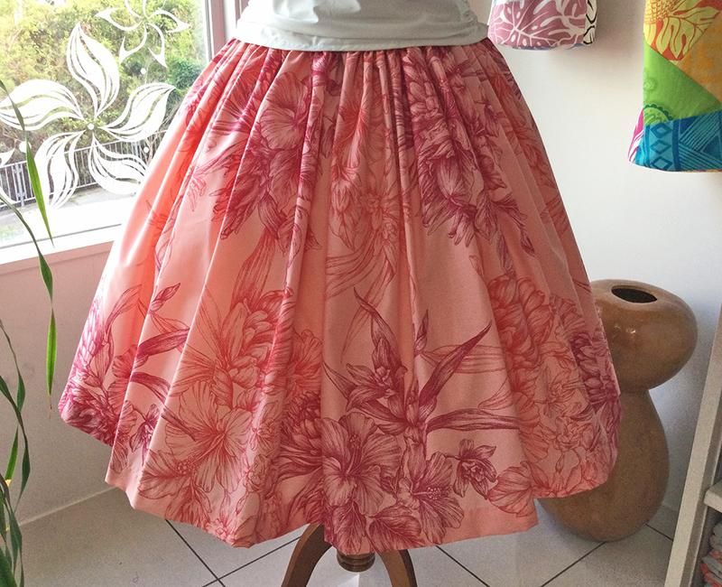 TOP > Pink Lei シングルパウ コーラルピンク・プロテア&ハイビスカス柄 ウエストゴム4本 丈73cm
