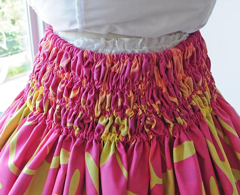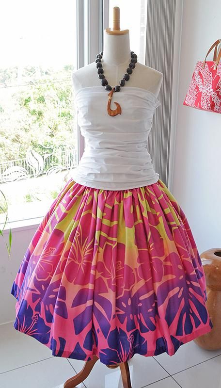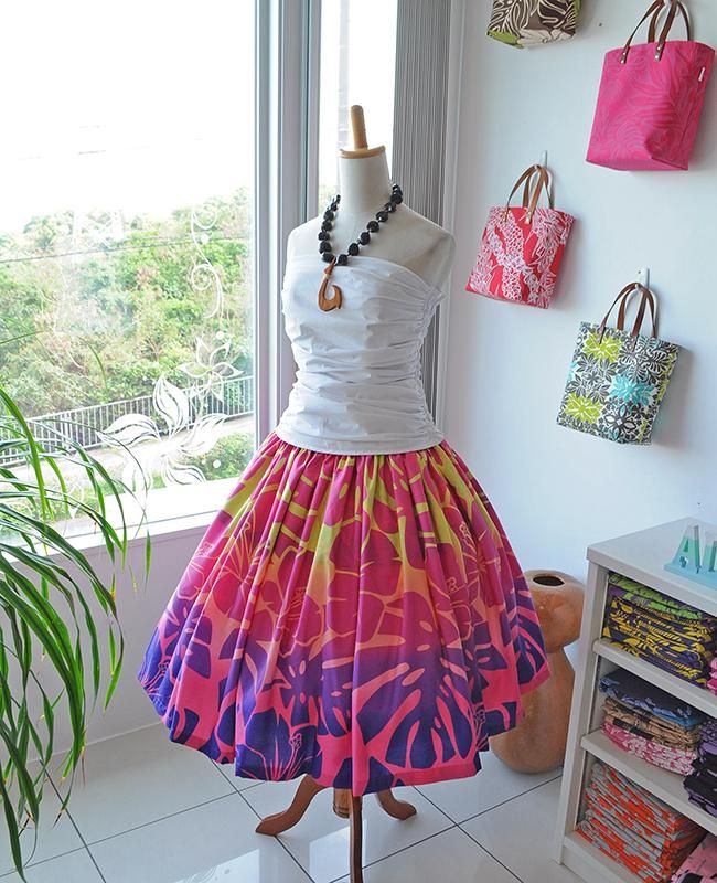 TOP > Pink Lei シングルパウ イエロー〜ピンクグラデーション・ハイビスカス&モンステラ柄 ウエストゴム4本 丈73cm