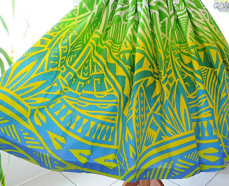 TOP > Pink Lei シングルパウ グリーン&イエロー&ブルーグラデーション タパ柄 ウエストゴム4本 丈73cm