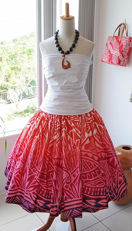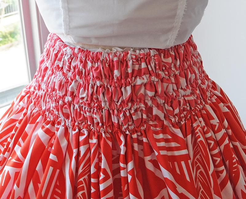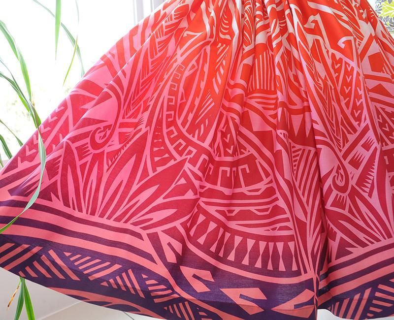 TOP > Pink Lei シングルパウ ホワイト〜レッド〜パープルグラデーション タパ柄 ウエストゴム4本 丈73cm
