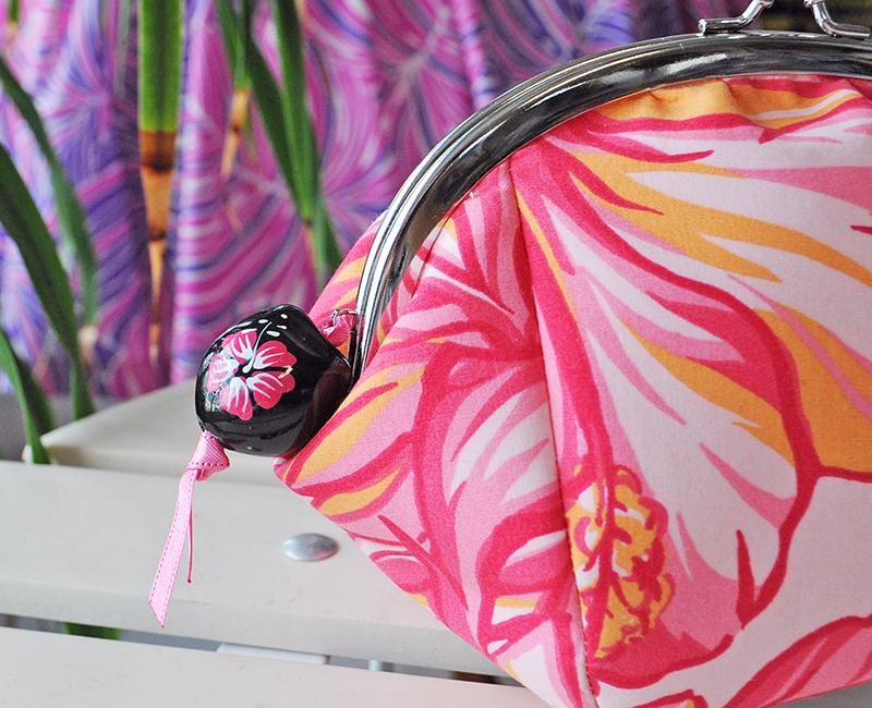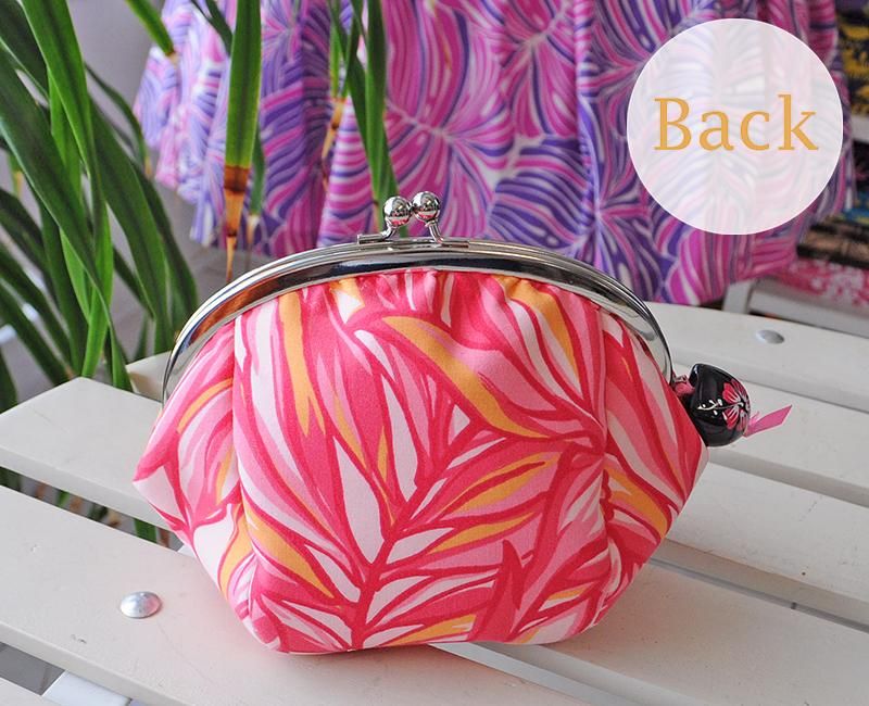 がま口タイプのコロコロポーチ ピンク&イエロー・ハイビスカス&トロピカルリーフ柄