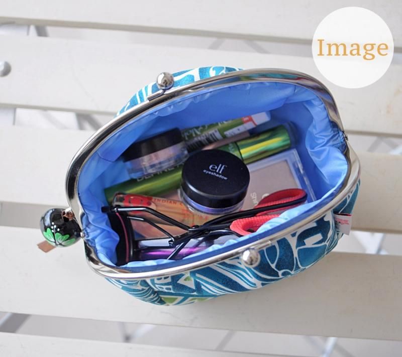 長さ約16cmのがま口を使用し、口が大きく開くので中身がひと目で確認できます。裏地には防水布を使用。お直し用のメイクアップ用品やアクセサリー類、お薬なども十分に収納できる嬉しいサイズ感です。