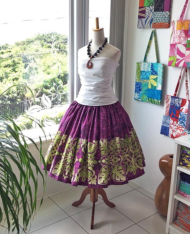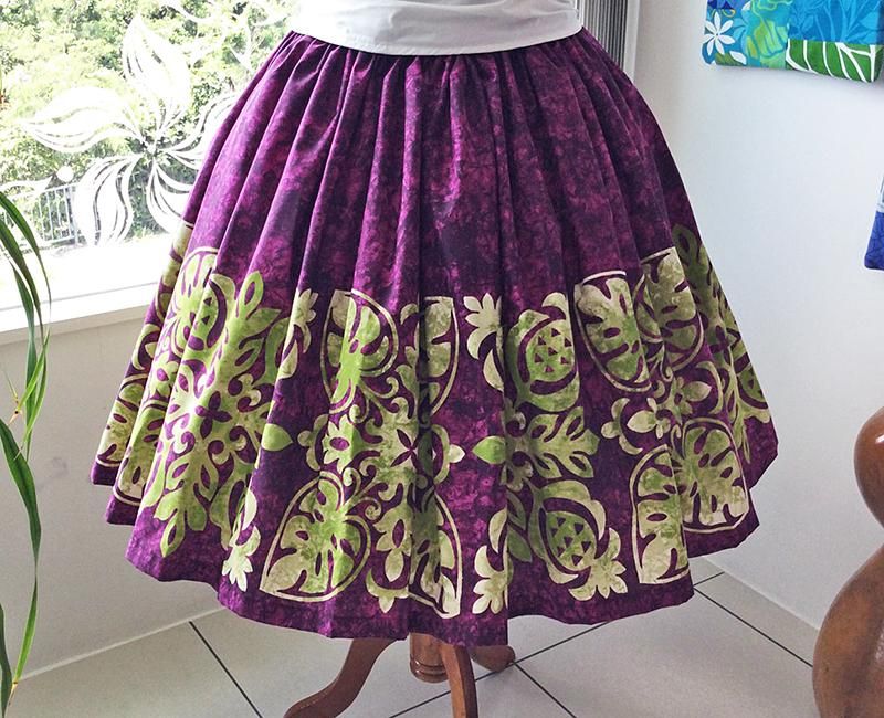TOP > Pink Lei シングルパウ パープル&ライムグリーン・ハワイアンキルト柄 ウエストゴム4本 丈73cm