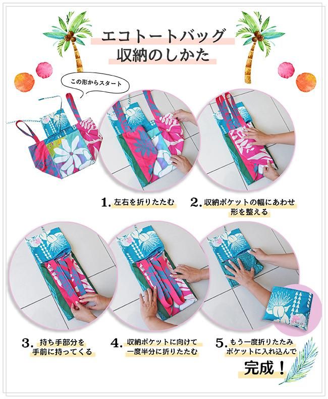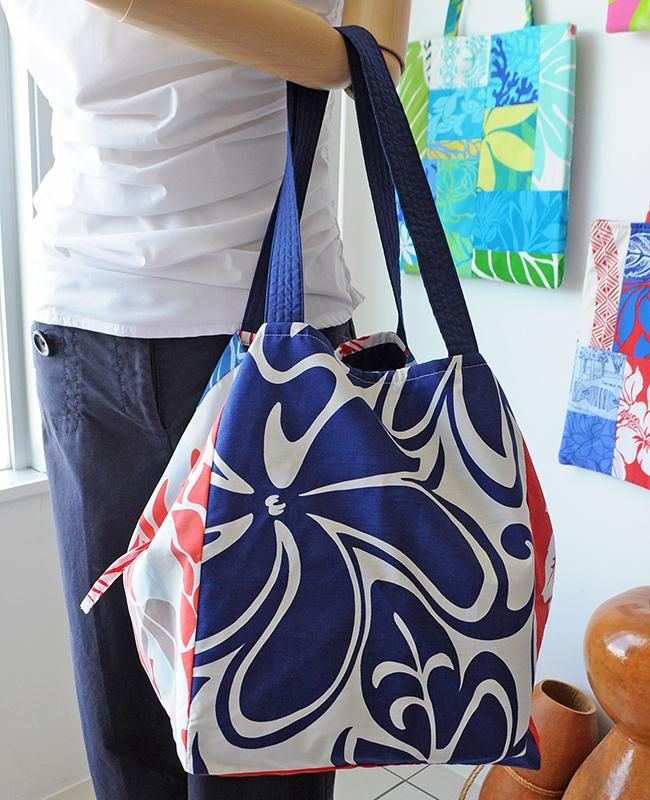 ハワイアンファブリック特有の華やかな柄が目を引くシンプルな作りながら、使いやすさ重視のこだわりをたくさん詰め込んだエコトートバッグです。