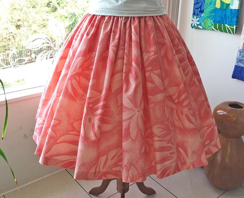 TOP > Pink Lei シングルパウ サーモンピンク・ティアレ&モンステラ柄 ウエストゴム4本 丈73cm