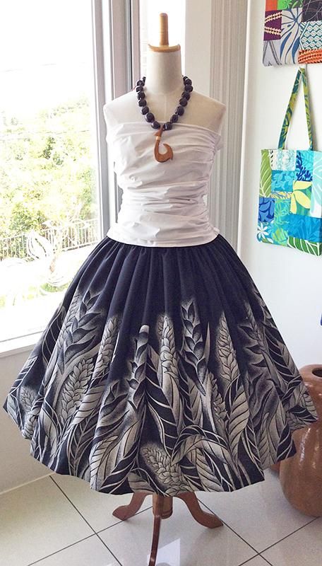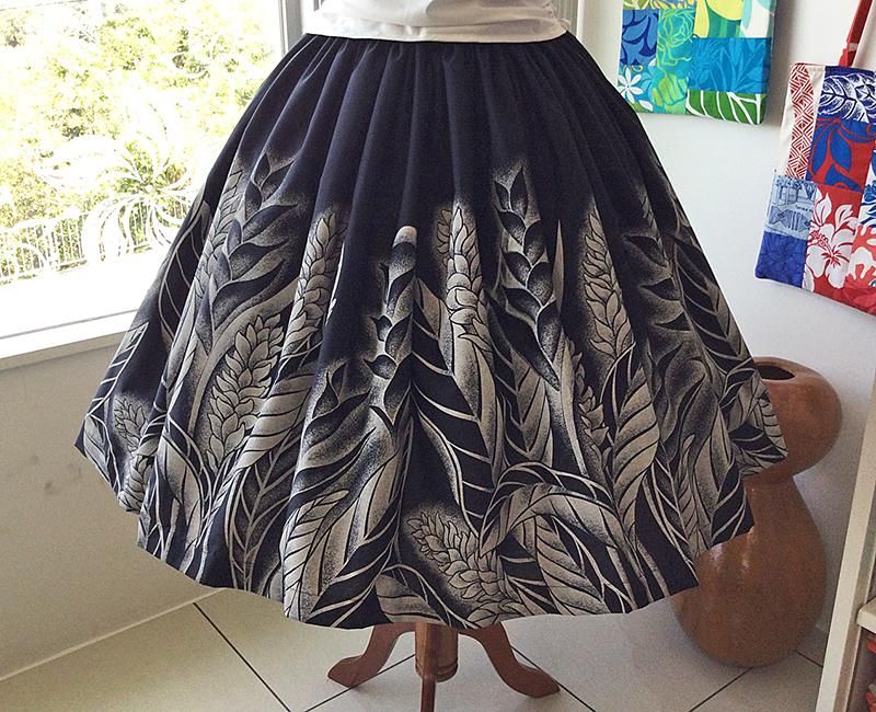 TOP > Pink Lei シングルパウ ブラック&サンドベージュ・ジンジャー&ヘリコニア柄 ウエストゴム4本 丈73cm