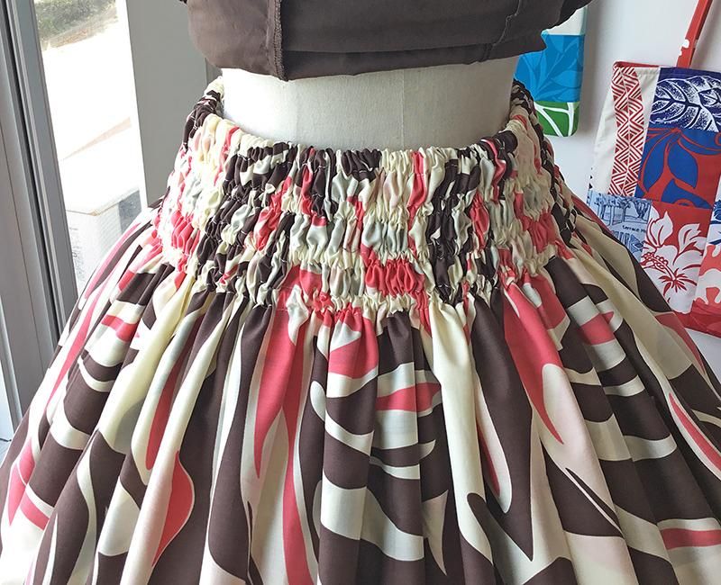 TOP > 【一点もの】Pink Lei シングルパウ アイボリー&ブラウン&ピンク・モンステラ柄 ウエストゴム4本 丈73cm