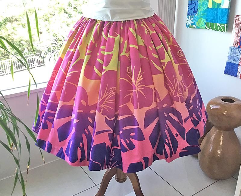 TOP > Pink Lei シングルパウ ピンク&パープル&ライムグラデーション・ハイビスカス&モンステラ柄 ウエストゴム4本 丈73cm