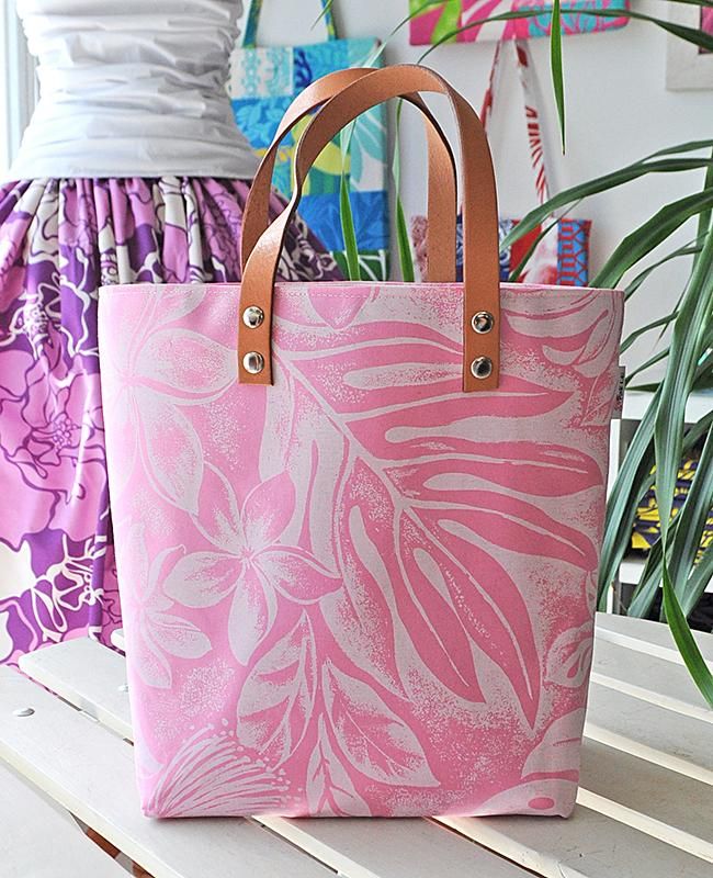 Pink Lei 【1点もの】ショッピングトートバッグ(帆布) ピンク&ホワイト・トロピカルリーフ柄