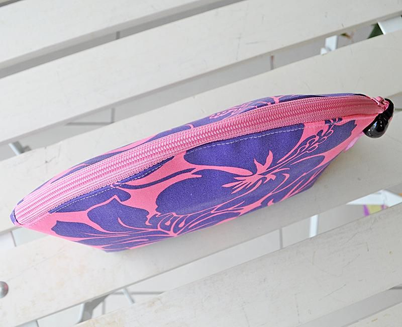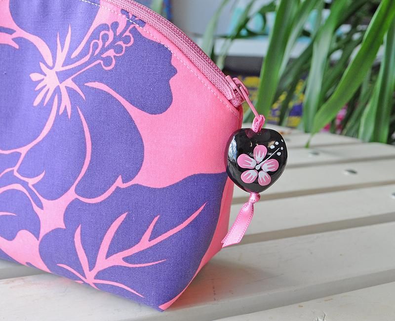 TOP > Pink Lei オリジナル【1点もの】 シェル型ファスナーポーチ パープル&ピンク・ハイビスカス柄