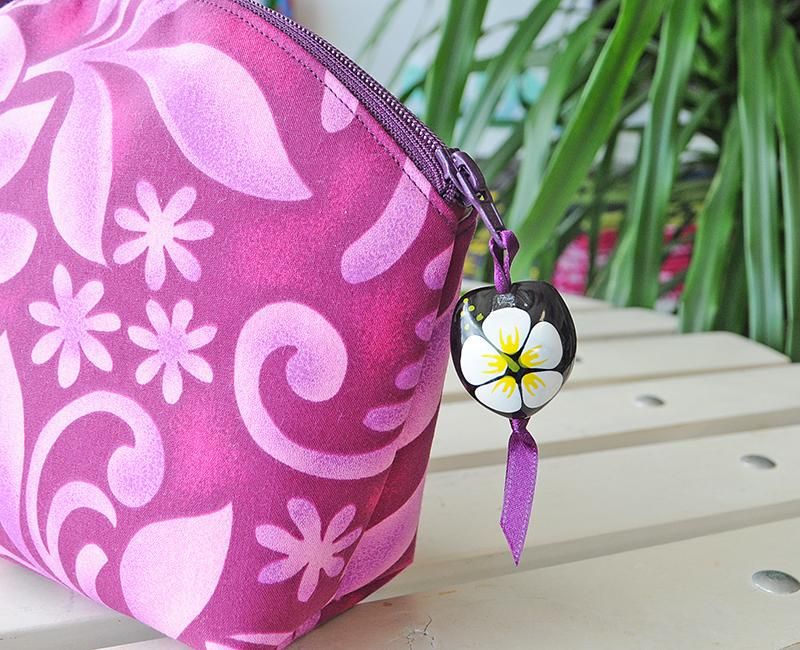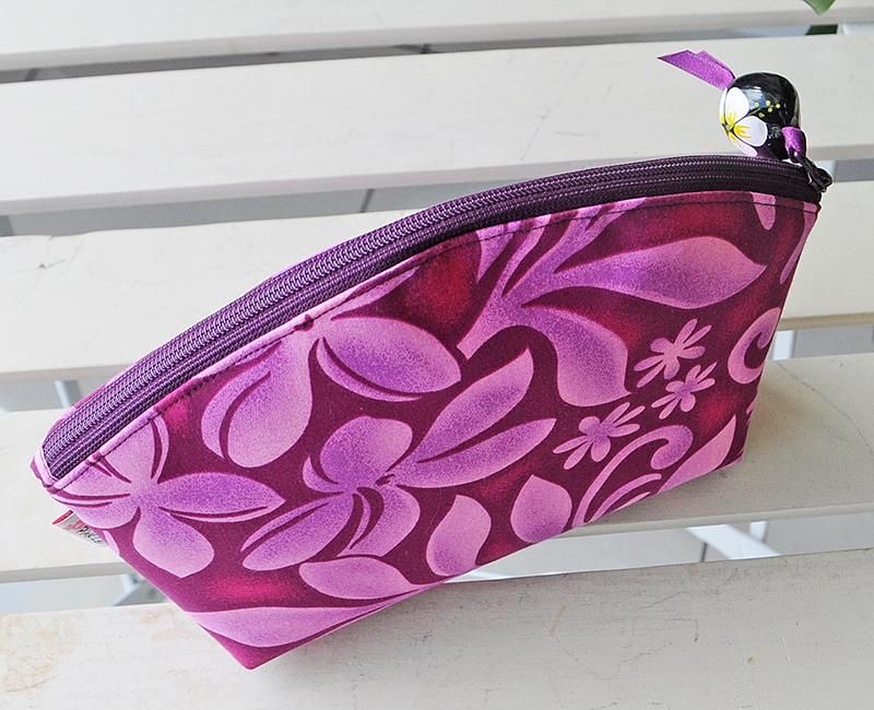 TOP > Pink Lei オリジナル【1点もの】 シェル型ファスナーポーチ パープル&ピンク・プルメリア&ハイビスカス柄