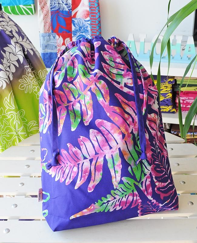 TOP > Pink Lei オリジナル 〜新商品〜 巾着袋 ブルー&ピンク&グリーンタイダイ/シダ柄【1点もの】